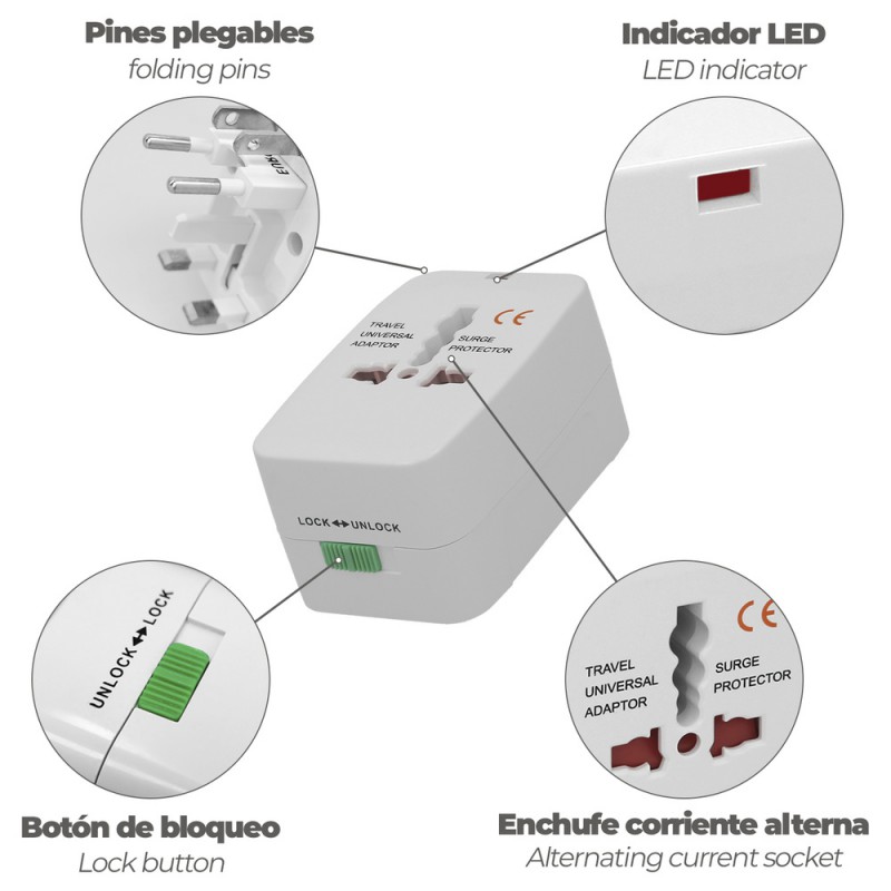 - Compatibilidad universal: Acepta múltiples tipos de enchufes de diferentes regiones, lo que lo convierte en un accesorio versátil y práctico para personas que viajan con dispositivos electrónicos o equipos eléctricos.