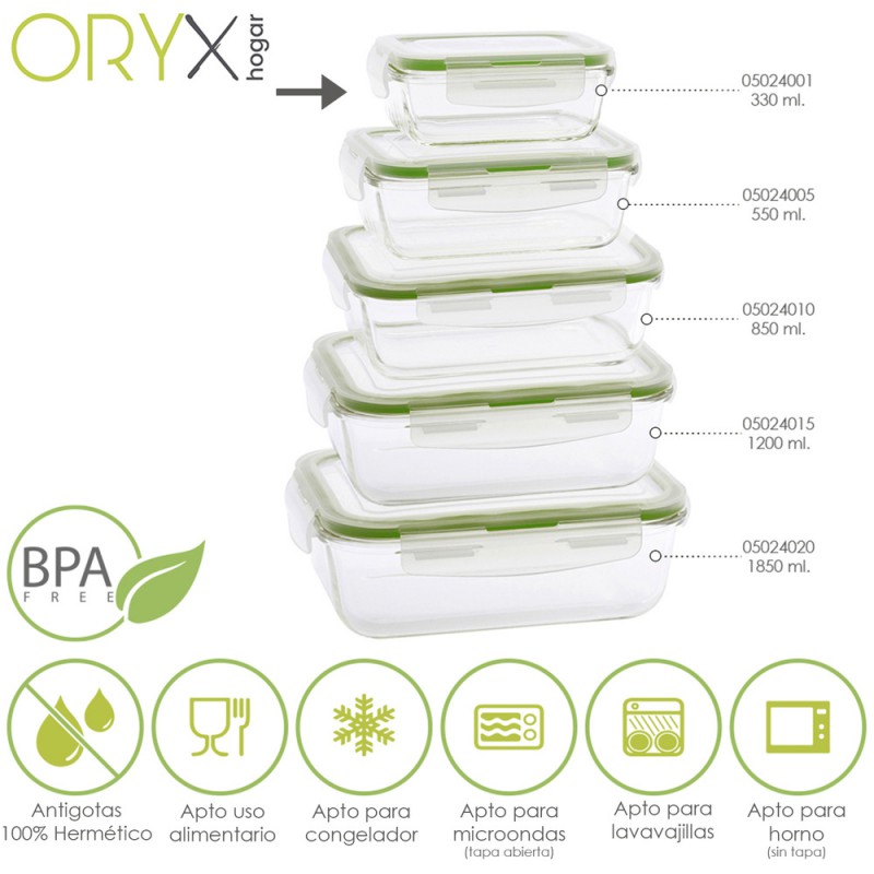 - Recipientes herméticos para una mejor conservación y un transporte sin derrames, no conserva olor ni sabor de alimentos contenidos anteriormente. Las tapas cuentan con un sistema de 4 cierres de bloqueo además están realizadas en silicona inyectada que se adhiere al cristal aislando los alimentos de gérmenes y olores externos y favoreciendo su perfecta conservación.
